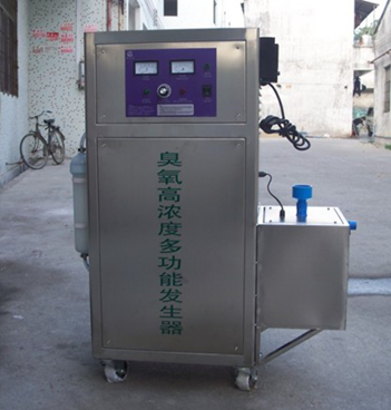 1. 直接吹送法:適用于容積較小的車間 1.1將機器安裝在消毒間外通風干燥的地方。 1.2連接臭氧硅膠輸送管,管道出氣口應置于車間內2/3以上的高度,以便于臭氧彌漫于整個消毒間。20克以下為風冷臭氧發生器,通電直接使用;20克以上為風冷+水冷臭氧發生器,需要外接冷卻水。 外接冷卻水的方法有兩種:直接連接自來水或用水箱+循環泵做一個循環利用的 水系統。下圖為外接冷卻水箱的40克臭氧發生器: